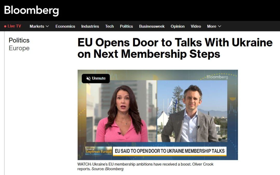 ЕС в ближайшие недели может начать переговоры о вступлении в него Украины, пишет Bloomberg со ссылкой на источник