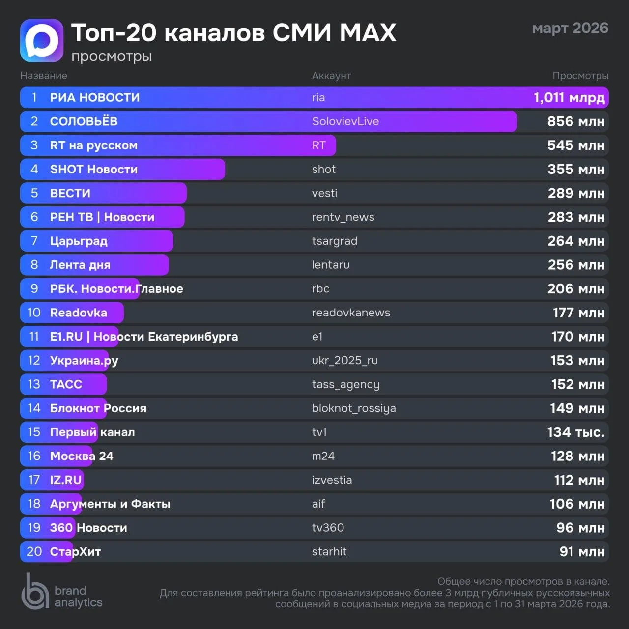 Как считали? Эксперты проанализировали более 3 миллиардов публичных сообщений в русскоязычном сегменте соцмедиа за март. В рейтинге участвовали только официальные каналы СМИ.
