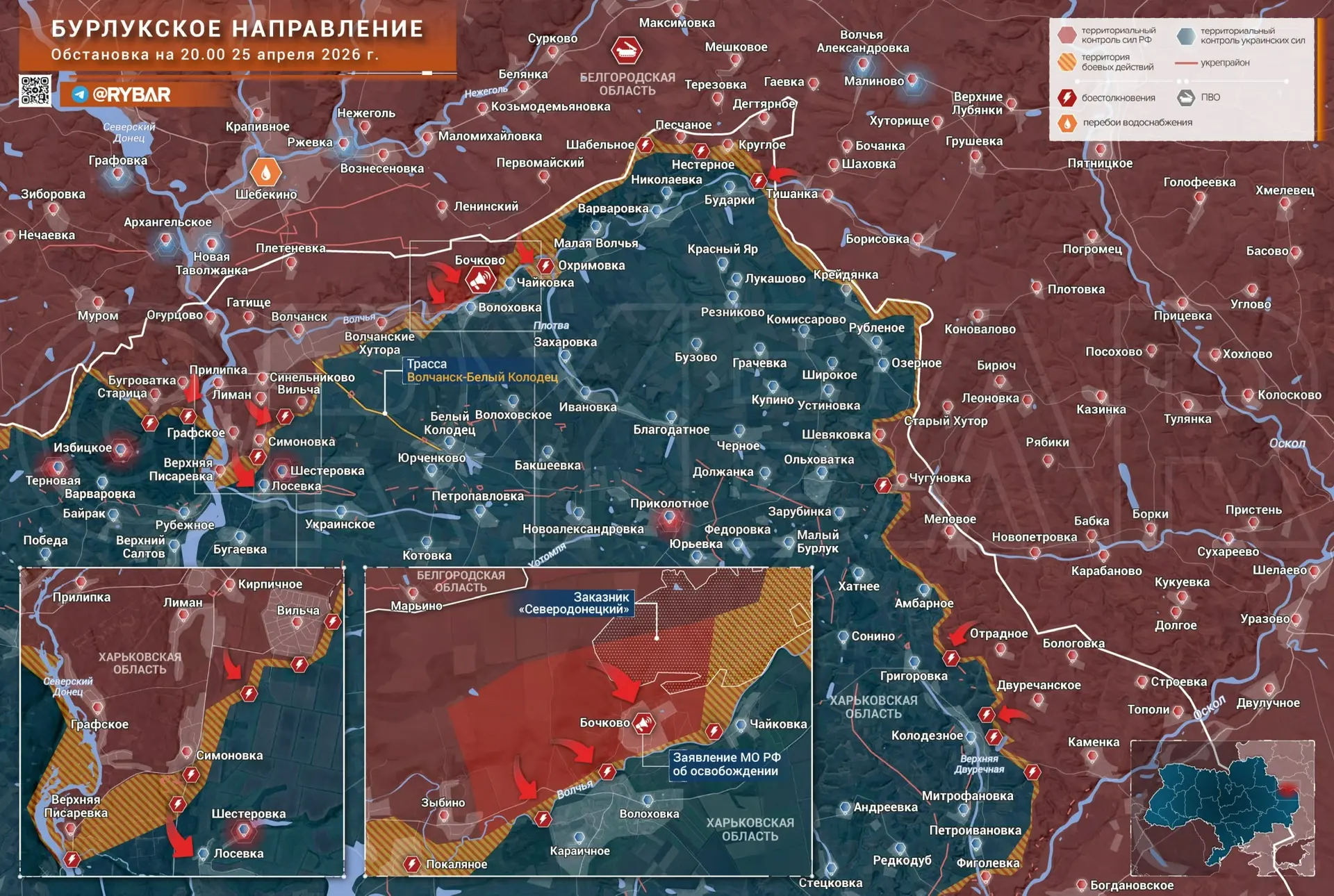 На Бурлукском направлении части ГВ «Север» планомерно занимают рубежи в приграничье Харьковской области. Утром 25 апреля стало известно об освобождении российскими бойцами Бочково, бои за которое начались несколькими днями ранее.