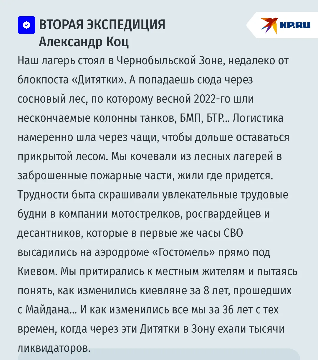Журналисты KP.RU Александр Коц и Дмитрий Стешин побывали в этой мертвой Чернобыльской Зоне дважды. 20 лет спустя после катастрофы, когда "сталкеры" водили туда "экскурсии" для экстремалов. И весной 2022-го, когда российские войска шли через Зону Отчуждения на Киев.