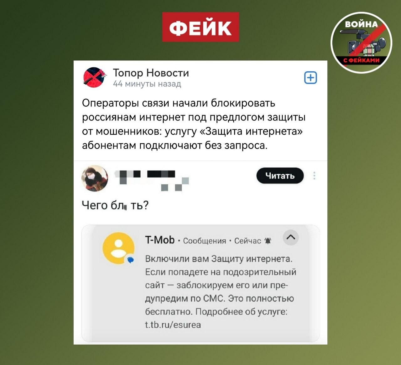 Правда: Перед нами типичное искажение фактов. Услуга «Защита интернета» для абонентов Т-мобайла, о которой идет речь в фейке, блокирует переход на фишинговые сайты для кражи личных данных и реквизитов банковских карт. Похожие сервисы есть и у других мобильных операторов.
