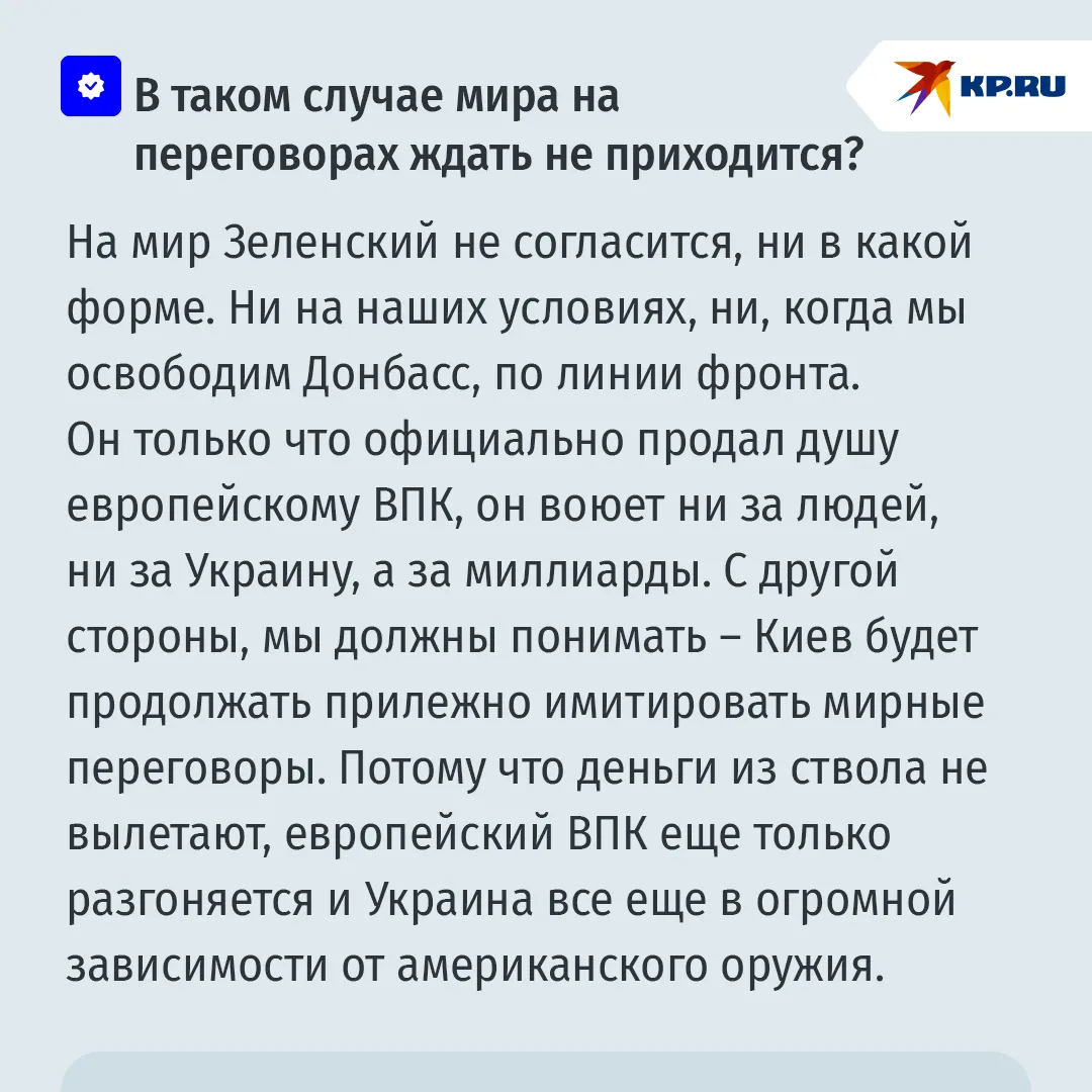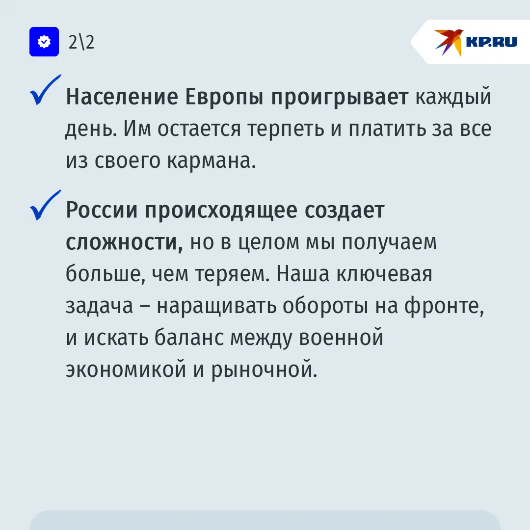 По мнению профессора ВШЭ Марата Баширова, Европа вкачала деньги в тяжелую промышленность. Им тотально важен конфликт на Украине. Потому что та продукция, которую они начали производить, не рождает спрос сама по себе. Бюргеры не покупают танки, им нужны комбайны. Соответственно, продукт нужно утилизировать на Украине. Поэтому из каждого утюга в ЕС кричат о необходимости создать свое, европейское НАТО.