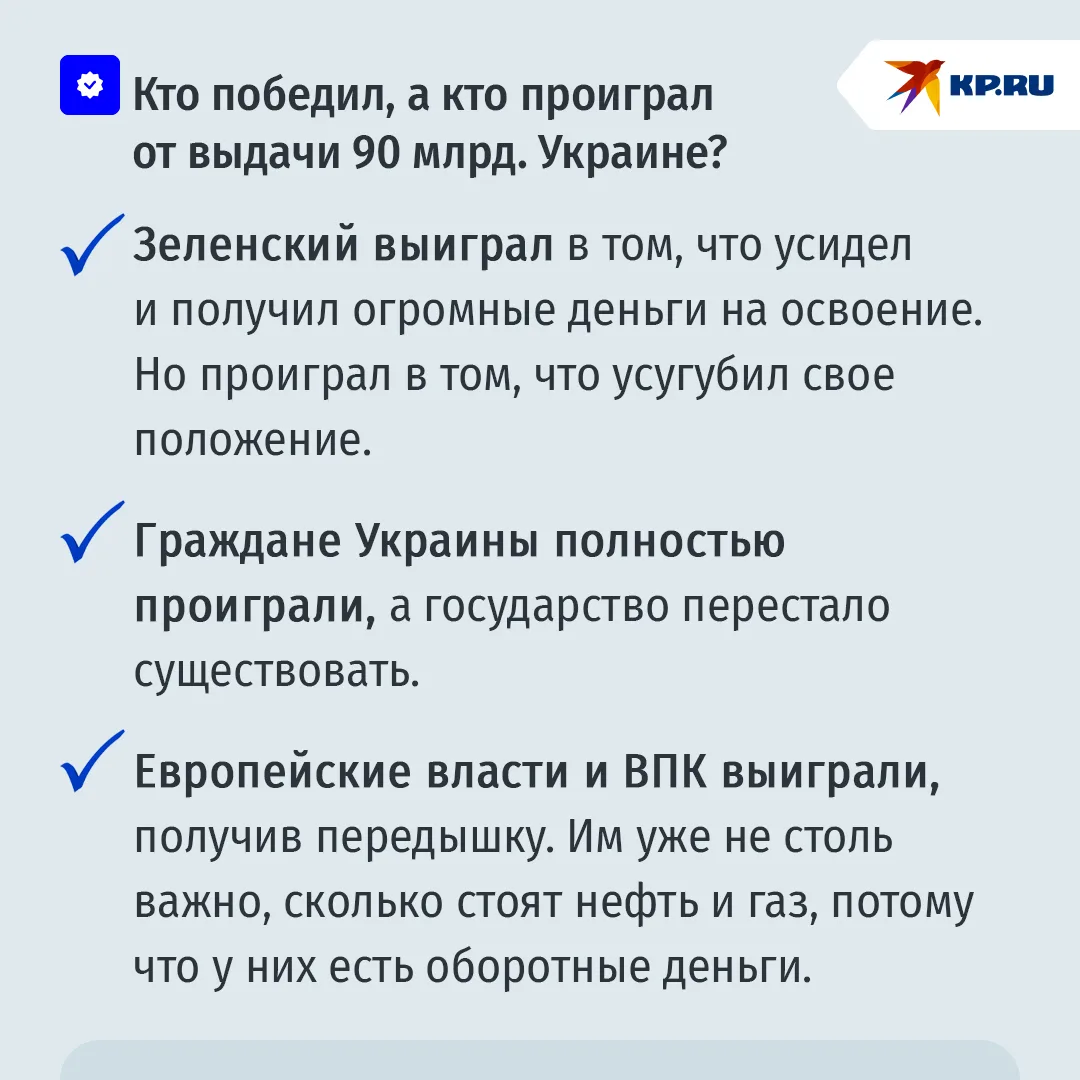 Как бы громко это не звучало, но деньги на две трети останутся в Европе или пойдут на закупку вооружений у НАТО. Только оставшаяся треть будет перечислена Украине. Здесь происходит подмена понятий: деньги ЕС Украина якобы тратит на социальные нужды. А доходы своего бюджета якобы все идут на военные расходы. Хотя по факту Европа спонсирует продолжение конфликта, но юридически – социалку.