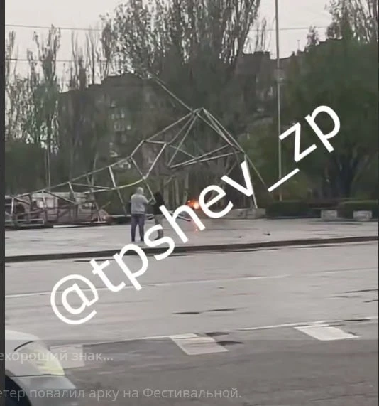 Шквалистый ветер повалил в центре временно оккупированного Запорожья арку с надписью "Запорожье — колыбель государственности Украины".