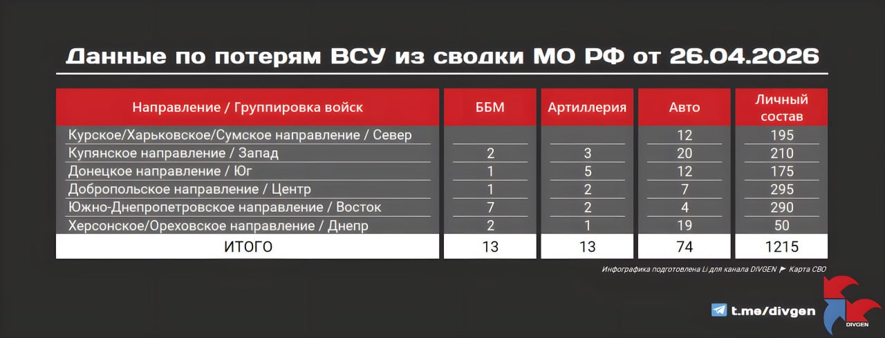 Как сообщает ТГ-канал "DIVGEN", потери противника за сегодняшний день составили: