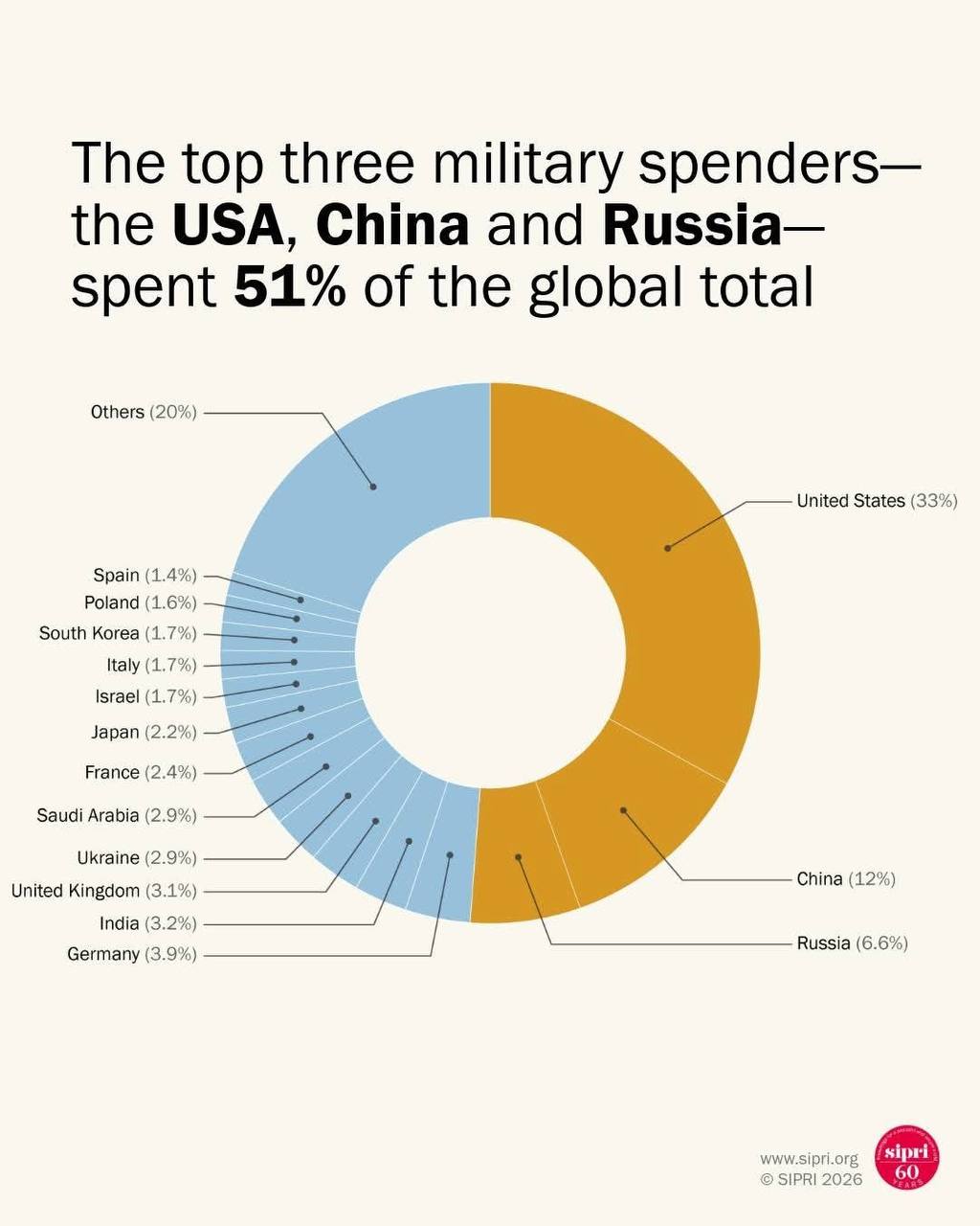 Крупнейшими военными бюджетами остаются США ($954 млрд), Китай ($336 млрд) и Россия ($190 млрд). На них приходится 51% мировых военных затрат.