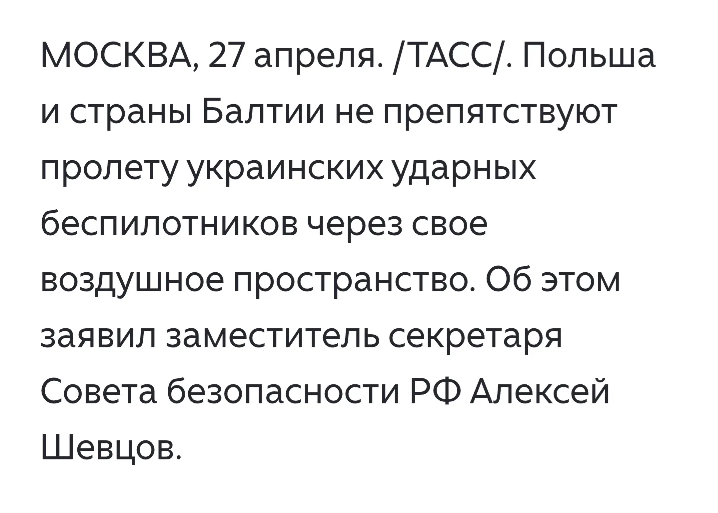 Дальше что? Надо ещё понимать, что беспилотник, пролетающий через Польшу в Россию, и беспилотник, который запускается с территории Польши - ничем не отличаются. Точка запуска не известна. То есть, по факту можно констатировать только то, что...