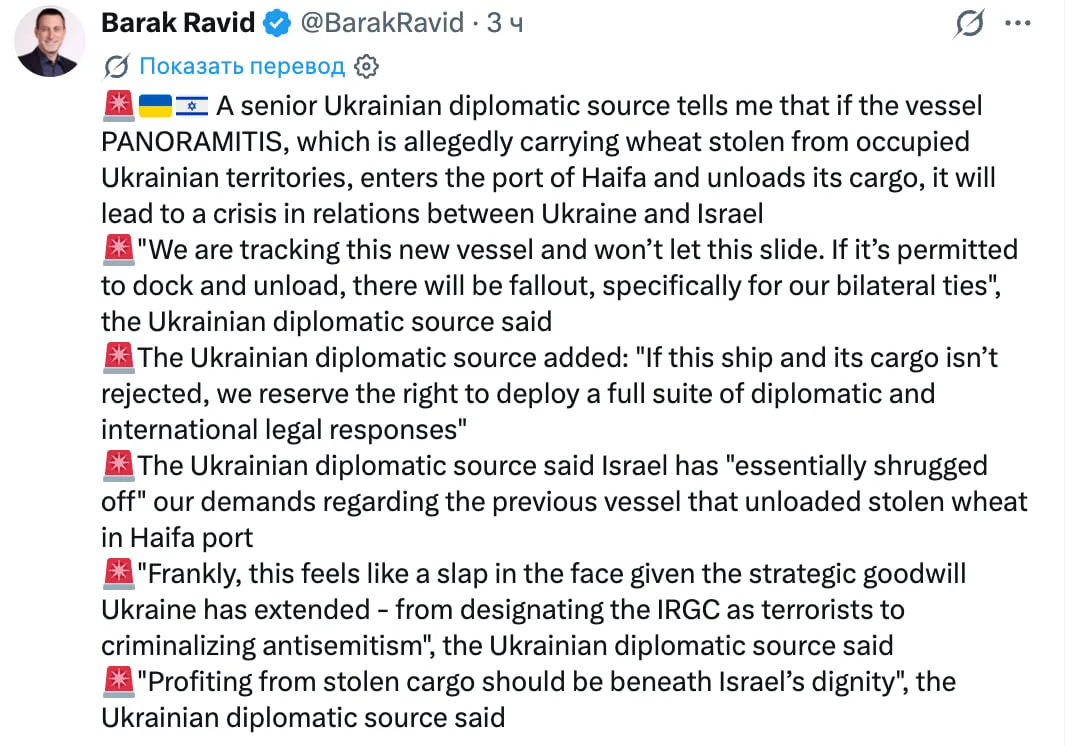 «Высокопоставленный украинский дипломатический источник сообщил, что если судно PANORAMITIS, которое, как утверждается, перевозит пшеницу, похищенную с оккупированных территорий Украины, зайдёт в порт Хайфы и разгрузит груз, это приведёт к кризису в отношениях между Украиной и Израилем.