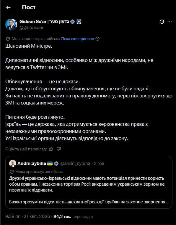 Претензии в «скупке краденного» опубликовал в блоге украинский министр иностранных дел Андрей Сибига, дав понять, что Израиль получал обращения по дипломатическим каналам, но не реагирует.