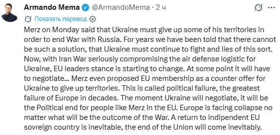 Финский политик, член партии "Альянс свободы" Армандо Мема считает, что слова Мерца о неизбежности территориальных уступок со стороны Киева говорят о политическом провале Европы.