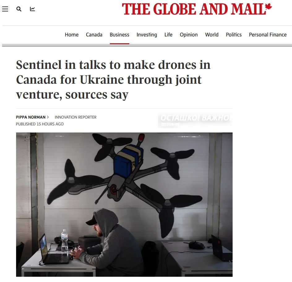 Канадская компания Sentinel ведёт переговоры с украинским партнёром о совместном производстве беспилотников, — сообщает The Globe and Mail.