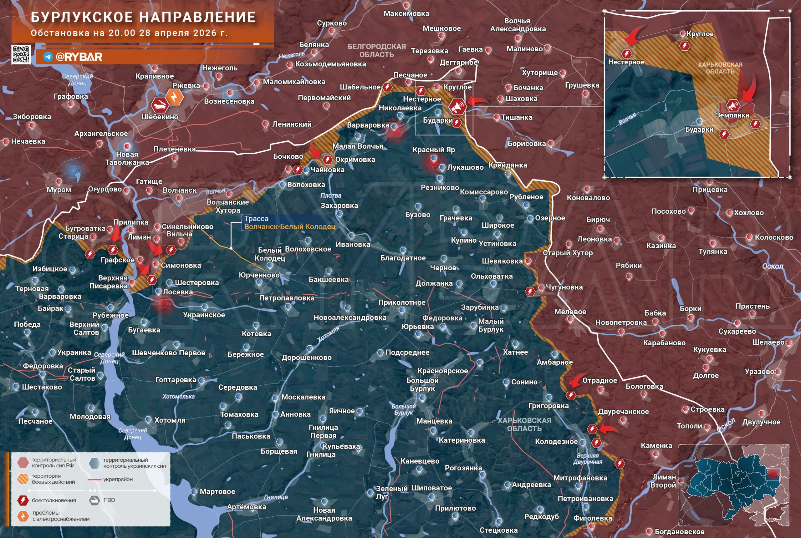 Зачищены Волчанские Хутора, Зыбино и Бочково, начались бои за Покаляное и Охримовку. Скорее всего, ВС РФ будут идти навстречу тем подразделениям, которые атакуют со стороны Волчанска на восток, с целью соединить несколько разрозненных плацдармов «по земле» в один большой.
