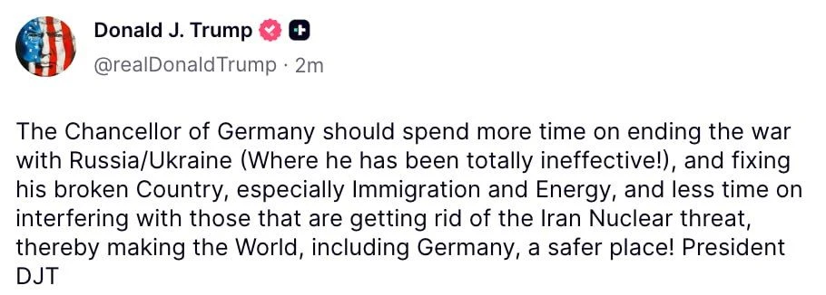 «Канцлеру Германии следует больше времени уделять прекращению войны с Россией/Украиной [в чём он был совершенно неэффективен!], а также наведению порядка в своей стране — особенно в вопросах иммиграции и энергетики — и меньше вмешиваться в действия тех, кто устраняет ядерную угрозу со стороны Ирана, тем самым делая мир, включая Германию, более безопасным!».