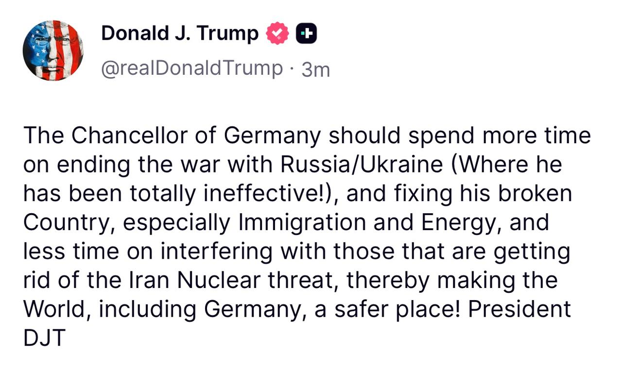 Трамп - призвал Мерца не лезть в Иран, а заняться конфликтом на Украине и внутренними проблемами Германии: