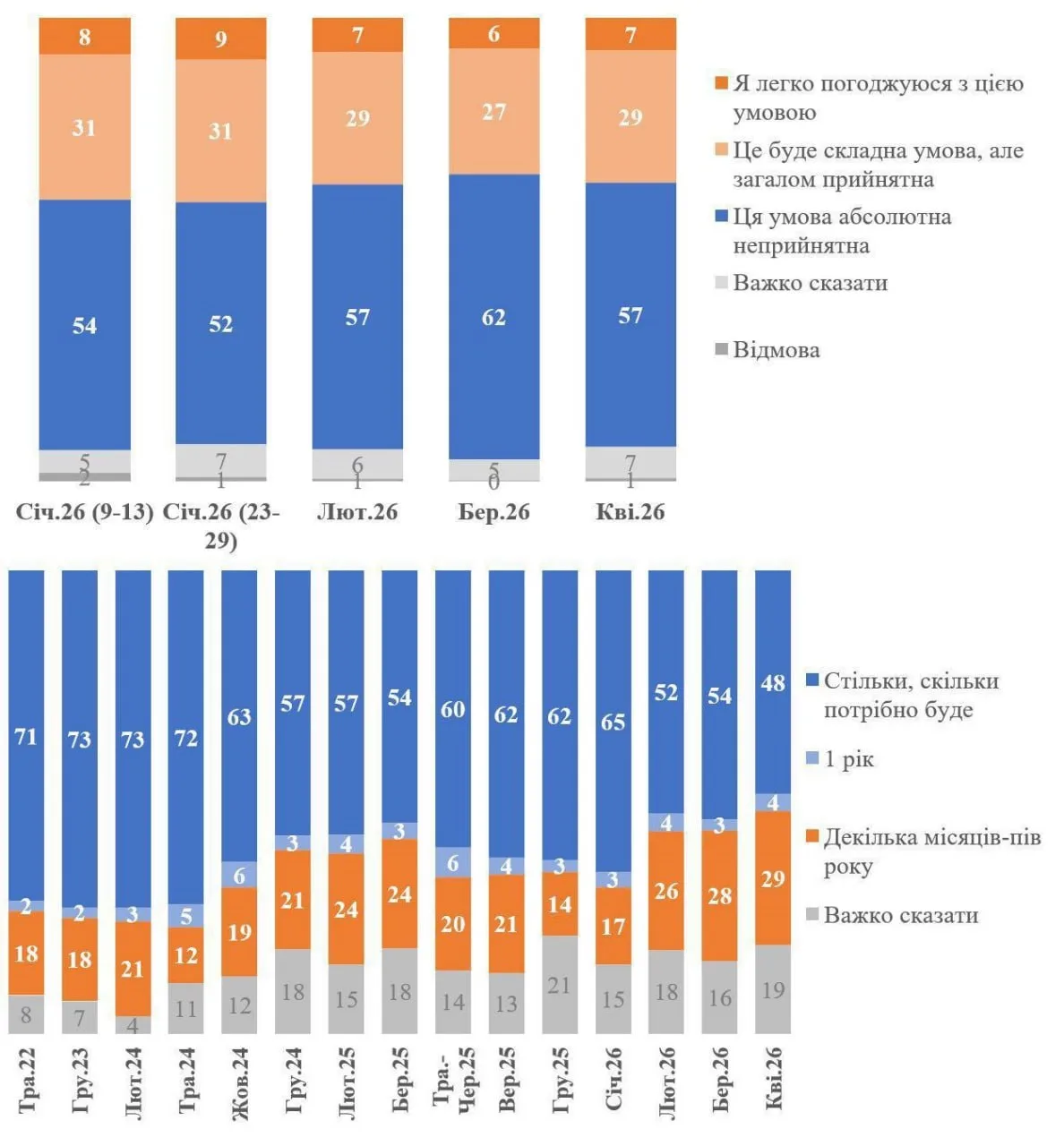 На Банковой, похоже, решили подкрепить курс на продолжение конфликта «правильной» социологией. По свежему опросу КМИС, 57% украинцев уже против вывода войск из Донецкой области в обмен на гарантии безопасности. Еще 36% допускают такой вариант, но называют его крайне сложным, а 7% не определились. При этом всего в марте тот же КМИС фиксировал обратную картину: 71% были готовы поддержать вывод войск из Донбасса ради гарантий.