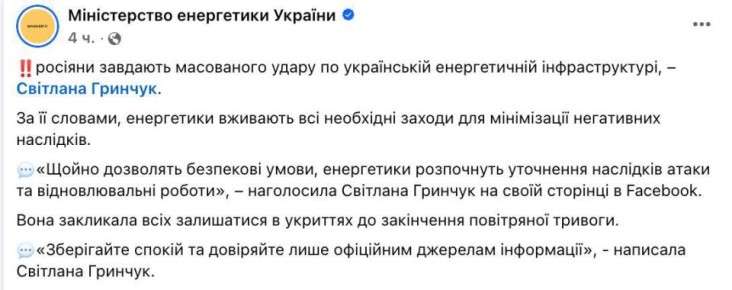 Предварительно были атакованы ТЭЦ, ГЭС, ТЭС и трансформаторы в разных регионах Украины.