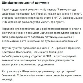 Рамочное соглашение о гарантиях безопасности для Украины состоит из 3-х пунктов:Если Россия снова пойдет в наступление, президент США получает право задействовать вооруженные силы, разведку, экономические и дипломатические действия и...